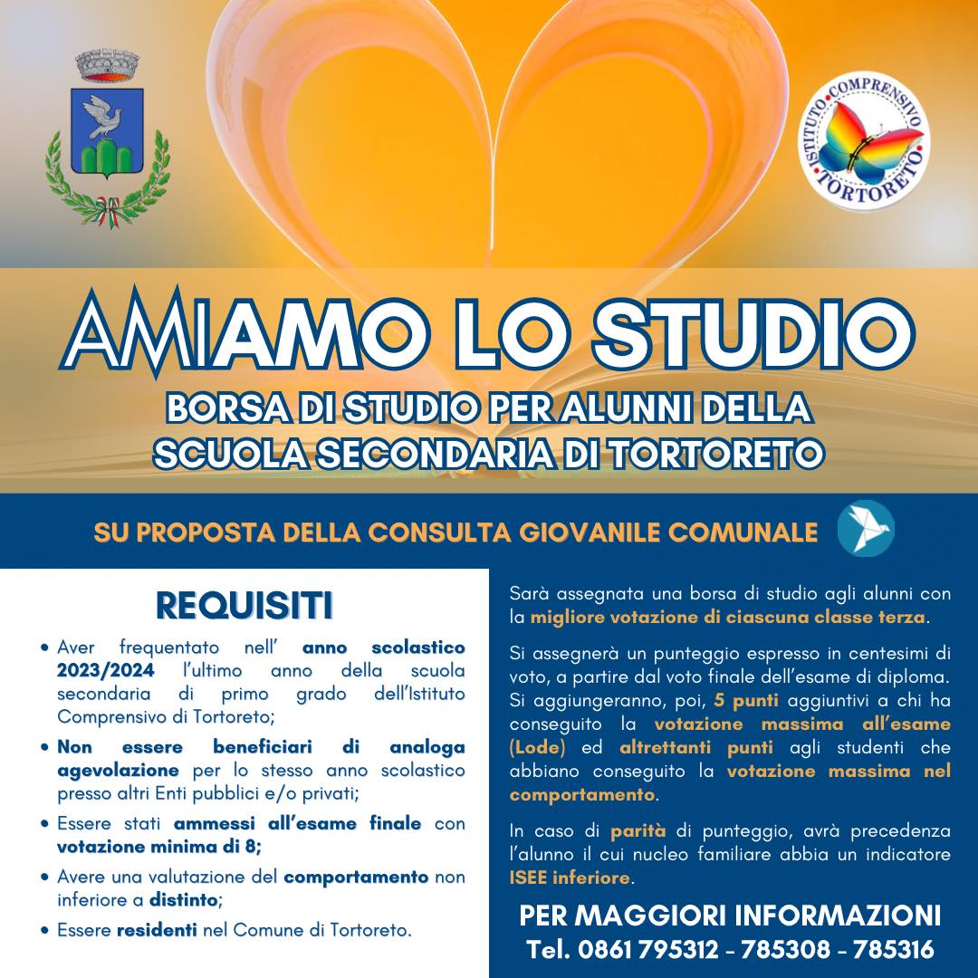 Borsa di studio per gli alunni della Scuola Secondaria dell’Istituto Comprensivo Tortoreto L’Amministrazione Comunale, in collaborazione con l’Istituto Comprensivo Tortoreto e su proposta della Consulta Giovanile Tortoreto, istituisce “AmiAMO LO STUDIO”. Con un contributo di 500 €, l’iniziativa premierà il migliore alunno di ciascuna classe terza della scuola secondaria. Tutti i dettagli sono disponibili nella locandina allegata.