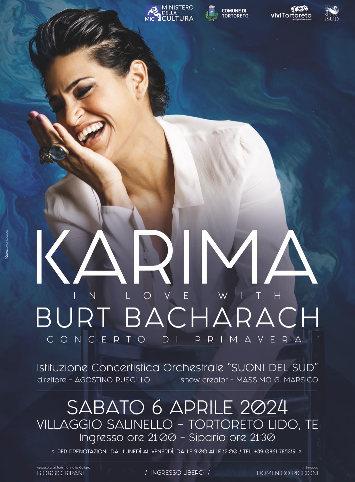 Il 6 Aprile, alle ore 21:00, non mancate alla III edizione del Concerto di Primavera del Comune di Tortoreto, che vedrà esibirsi KARIMA con l’Orchestra ICO Suoni del Sud. L’ingresso sarà gratuito, l’evento si terrà presso la Sala del Salinello Village. Le prenotazioni sono possibili dal Lunedì al Venerdì, dalle ore 9:00 alle ore 12:00, telefonando allo 0861 785319